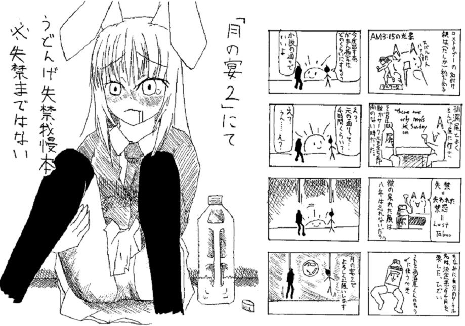 こちら↓ ん、まあ突っ込みたいところはもさもさありますがね? ね、いったいうどんげちゃんの口から何が垂れてるんだろうって事とかね。字、下手だよね、みたいなね。いろいろ荒いですよね。ねー。 あとなんですか。あれ俺ですか、あれが私ですか。あんなペット怪人になるくらいなら私は貞操帯になりたいです。もちろんトイレの自由を束縛するための。ごめんなさい嘘です。人がいいです。 ちなみに左側の漫画、判らん人にはよく判らないと思いますが、その辺り尿我慢ファンとそれ以外との感覚の違いなのかなと思うのですけれど、どうやら牛鬼的には、女の子に四時間五時間もおしっこを我慢させ続けるのは見ていられないそうです。そんな馬鹿な。 だって考えてみてくださいな、例えば判りやすい例として学校の授業なんてシチュエーションを挙げてみましょう(〇学生、〇校生、また学年等は嗜好、良心にお任せします)。一時間目の初めごろに軽い尿意を覚えた女の子がその休み時間うっかり話しこんでしまってその次、二時間目の休み時間に小走りにトイレに向かうも存外に並んでいて結局入ることが出来ずに三時間目に突入してしまいその三時間目がまた教師の御小言か何かで長引いてしまって、しかも状況が状況だから言い出すこともできず、そうこうしているうちに立ちあがれないほどになってしまいそのまま四時間目に突入、一時間授業にろくに集中できずにカタカタ震えて昼休みになり意を決して立ちあがり歩きだすもあからさまに我慢しているのが見て取れるほどに前かがみでトイレ三メートル前くらいで限界、決壊。 こんなんでだって三時間ちょいですよ、もっといじればまだまだ引き延ばせるんですよ。ふん、その辺り牛鬼はまだ良く判ってないよなあ。 あ、一応小説新しいのが出来ました。なかなか公開できるクオリティに思えないのと、あと次あたりは何か尿的な小説を公開したいと思ってしまっているので中々公開出来ないのですけれど……